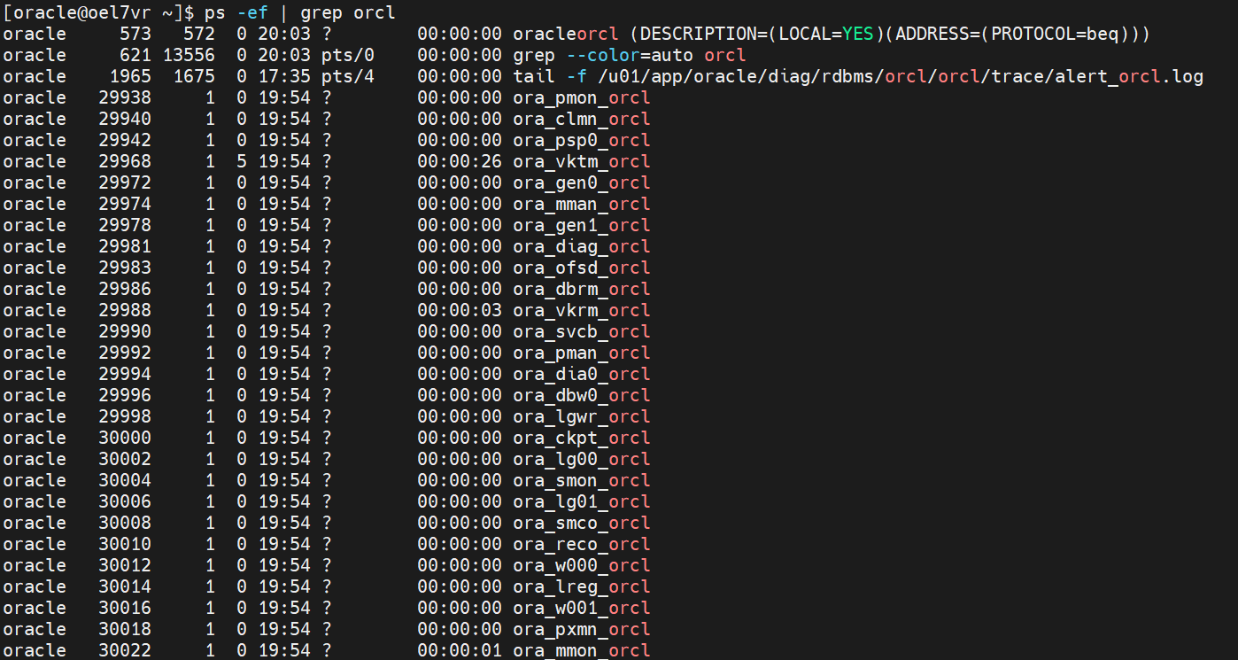 -- orcl 인스턴스의 백그라운드 프로세스 목록 확인 ps -ef | grep orcl -- 출력 예시 oracle 29938 1 0 19:54 ? 00:00:00 ora_pmon_orcl --여기서 29938이 PID -- 특정 프로세스 강제 종료 kill -9 [PID]
