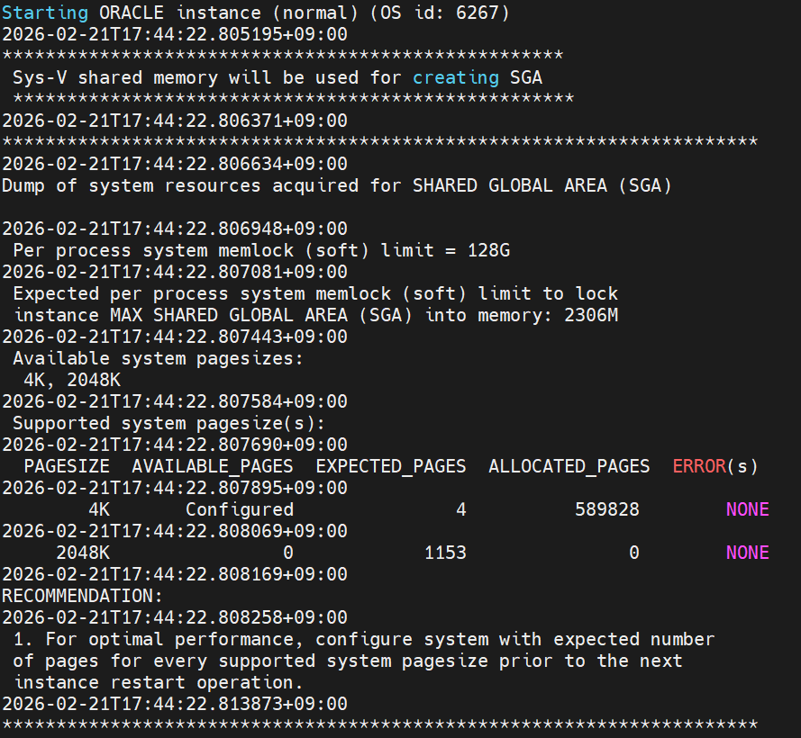 -- 전체 출력 cat alert_orcl.log -- 실시간 모니터링 (Ctrl+C로 종료) tail -f alert_orcl.log