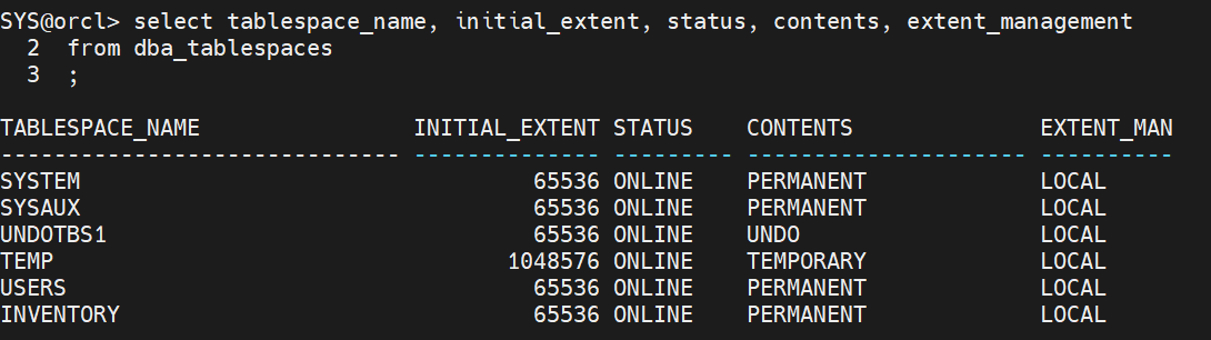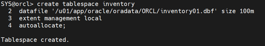-- Locally Managed Tablespace (LMT) 방식으로 생성 (default) CREATE TABLESPACE inventory DATAFILE '/u01/app/oracle/oradata/ORCL/inventory01.dbf' SIZE 100M EXTENT MANAGEMENT LOCAL -- LMT 방식 (기본값) AUTOALLOCATE; -- Oracle이 자동으로 extent 크기 결정