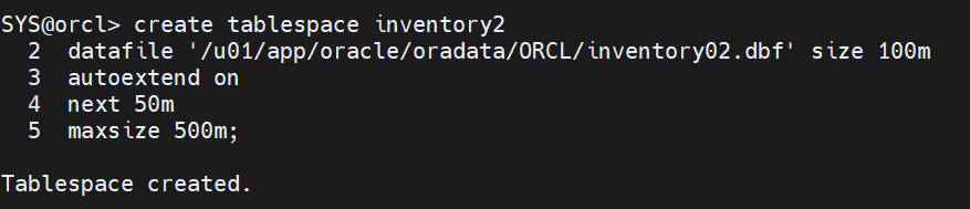 -- 데이터파일이 꽉 차면 자동으로 늘어나도록 설정 CREATE TABLESPACE inventory2 DATAFILE '/u01/app/oracle/oradata/ORCL/inventory02.dbf' SIZE 100M AUTOEXTEND ON -- 자동 확장 켜기 NEXT 50M -- 한 번에 50MB씩 늘어남 MAXSIZE 500M; -- 최대 500MB까지만