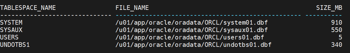 데이터 파일들의 경로 -- 테이블스페이스 목록 조회 SELECT TABLESPACE_NAME, STATUS, CONTENTS FROM DBA_TABLESPACES; -- 테이블스페이스별 데이터파일 조회 SELECT TABLESPACE_NAME, FILE_NAME, BYTES/1024/1024 AS SIZE_MB FROM DBA_DATA_FILES;