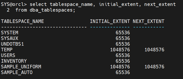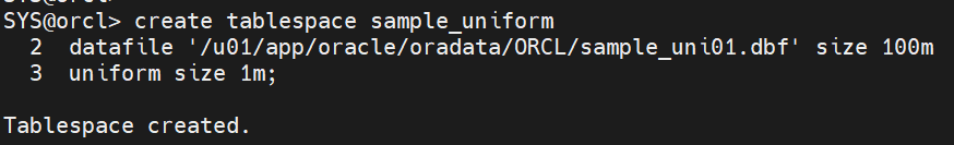 -- UNIFORM: 익스텐트를 항상 동일한 크기로 할당 CREATE TABLESPACE sample_uniform DATAFILE '/u01/app/oracle/oradata/ORCL/sample_uni01.dbf' SIZE 100M UNIFORM SIZE 1M; -- 1MB씩 동일하게 할당 -- AUTOALLOCATE: 오라클이 자동으로 적절한 크기 결정 (default) CREATE TABLESPACE sample_auto DATAFILE '/u01/app/oracle/oradata/ORCL/sample_auto01.dbf' SIZE 100M AUTOALLOCATE;