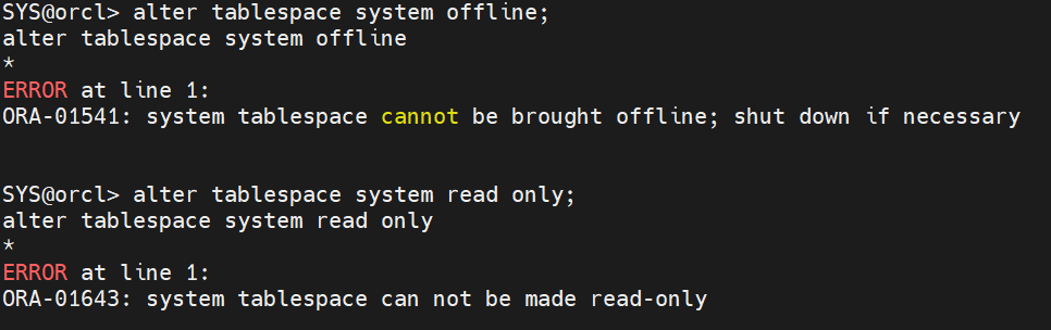-- 에러 확인 ALTER TABLESPACE system OFFLINE; -- ORA-01544: cannot offline system tablespace ALTER TABLESPACE system READ ONLY; -- ORA-01643: system tablespace can not be made read only