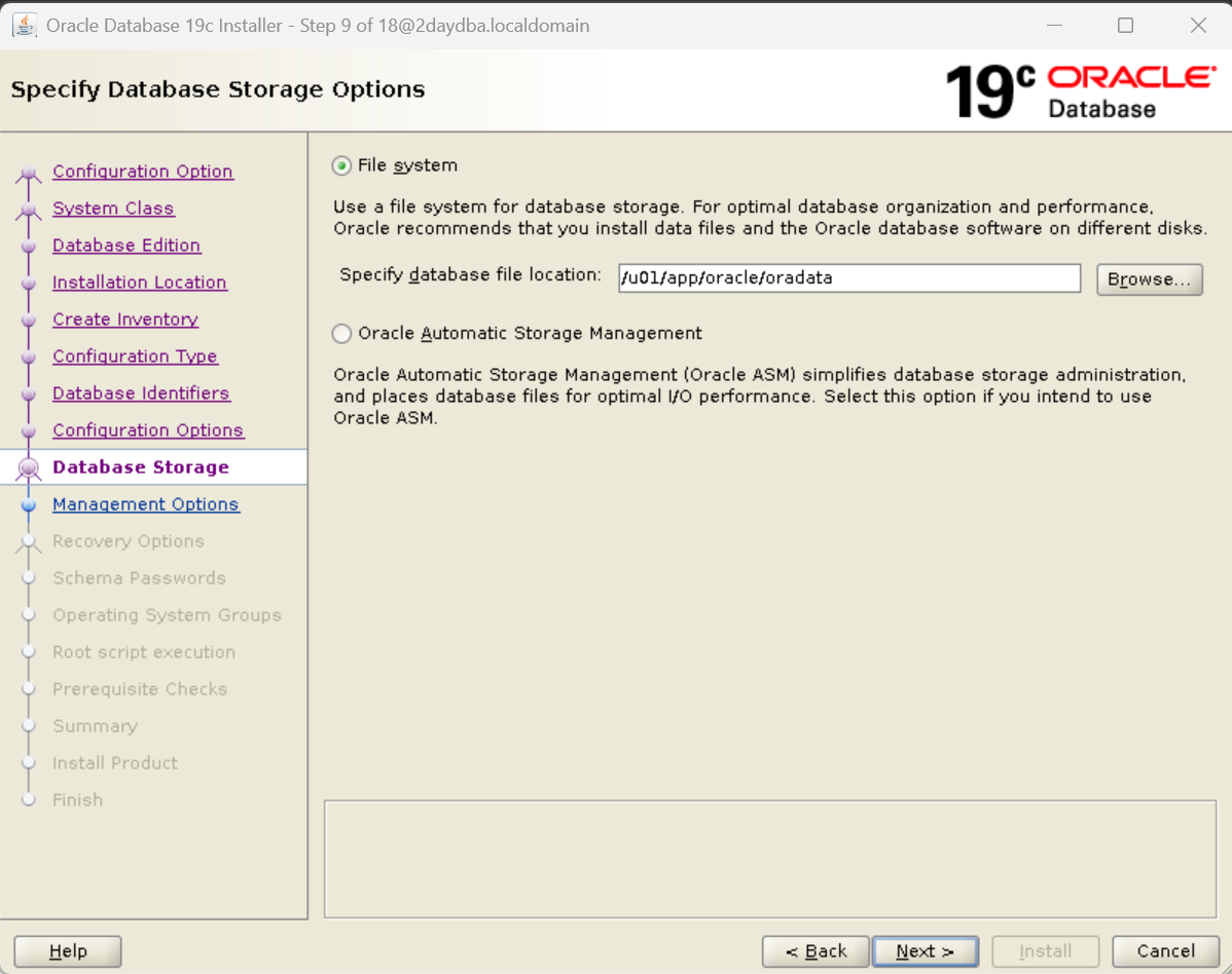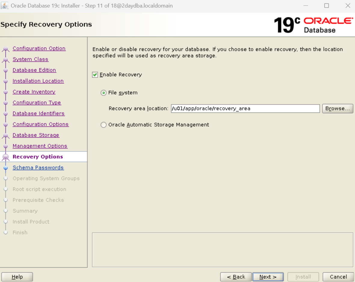 리커버리 영역을 파일시스템에 놓을 건지, ASM 디스크 그룹에 놓을 건지 결정하는 단계