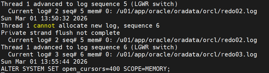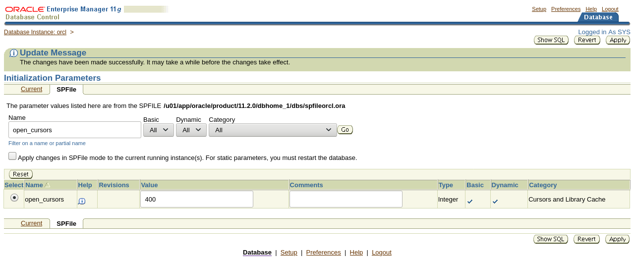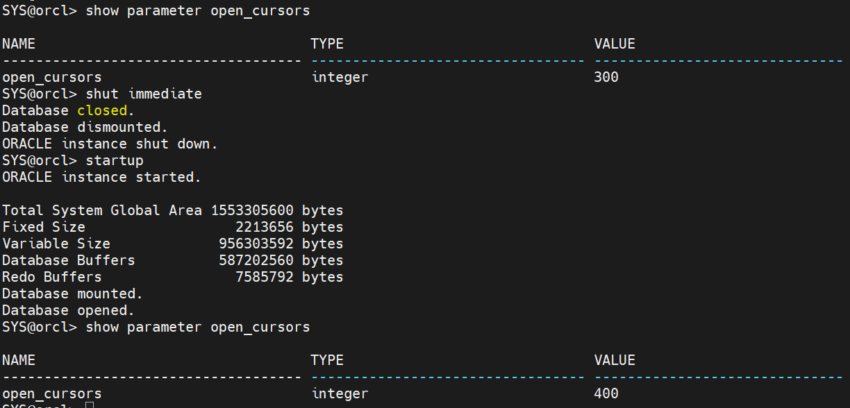 - SCOPE = BOTH: 변경된 값은 실행 중인 인스턴스와 서버 파라미터 파일 둘 다 적용됨, DB 재시작해도 변경 사항 유지됨