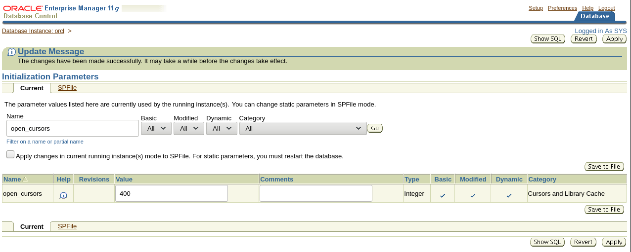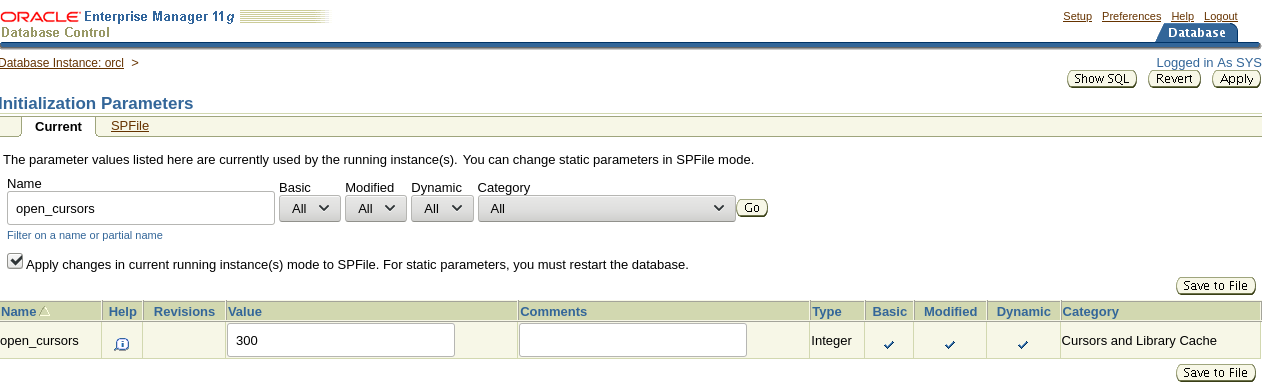 Server->Initialization Parameters 탭에서 초기화 파라미터 확인 가능 open_cursors 파라미터 수정 (최대 동시 커서 수 제한하는 동적 파라미터)