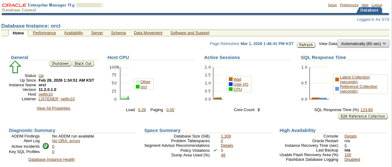 실습을 위해 오라클 11g 설치 후 Enterprise Manager 11g로 접속
