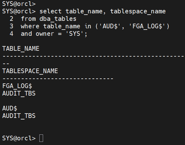 -- AUD$, FGA_LOG$ 테이블의 현재 위치 확인 SELECT table_name, tablespace_name FROM dba_tables WHERE table_name IN ('AUD$', 'FGA_LOG$') AND owner = 'SYS';