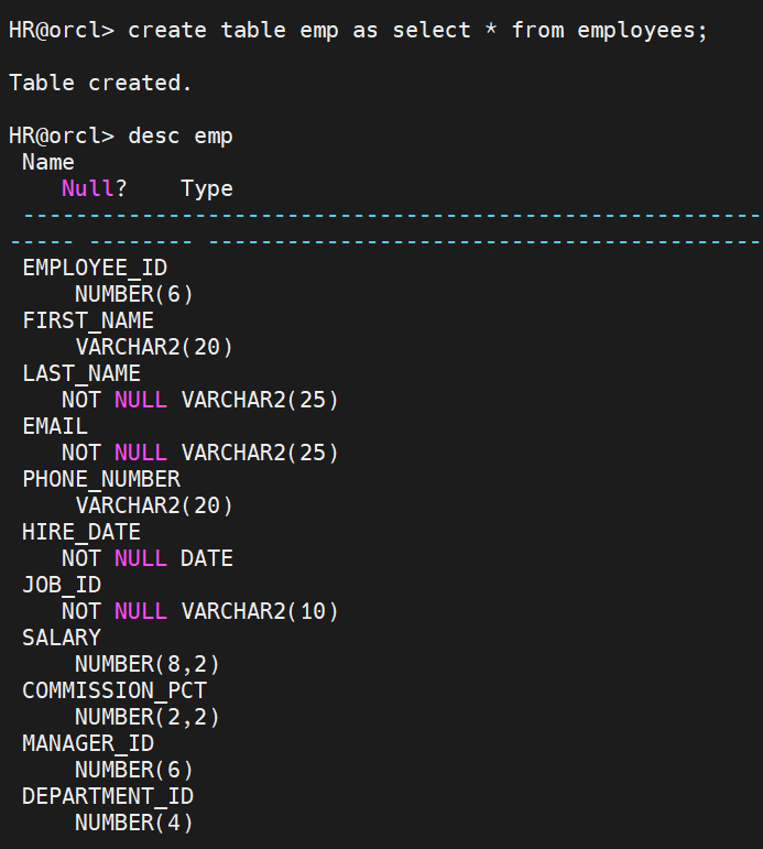 -- hr 계정에서 실습용 emp 테이블 생성 (CTAS) CREATE TABLE emp AS SELECT * from employees; -- [세션 1] hr 계정에서 100번 사원 UPDATE → 락 발생 UPDATE emp SET salary = 10000 WHERE employee_id = 100; -- COMMIT 하지 않은 상태로 유지 -- [세션 2] 동일한 행을 UPDATE 시도 → 세션 1이 COMMIT할 때까지 대기(블로킹) UPDATE emp SET salary = 20000 WHERE employee_id = 100;