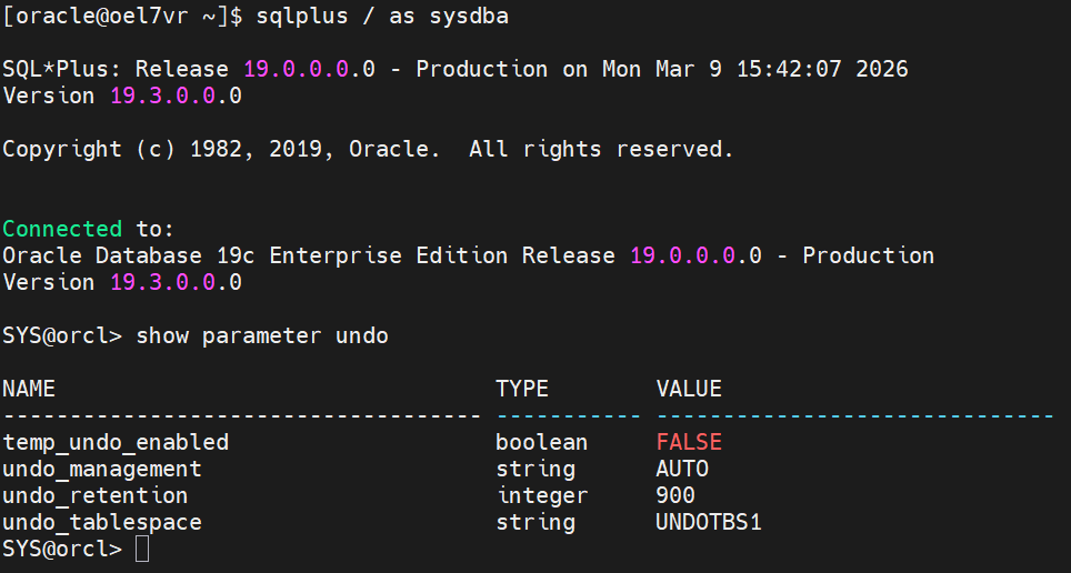 -- sys로 접속 CONN / AS SYSDBA -- Undo 관련 파라미터 확인 SHOW PARAMETER undo /* [결과] NAME TYPE VALUE --------------------- ------ -------- undo_management string AUTO ← 오라클이 자동 관리 undo_retention integer 900 ← 커밋 후 최소 900초(15분) 유지 노력 undo_tablespace string UNDOTBS1 ← 현재 사용 중인 Undo 테이블스페이스 */