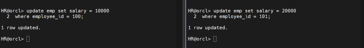 -- [세션 1] 100번 사원 UPDATE UPDATE emp SET salary = 10000 WHERE employee_id = 100; -- → 100번 행에 락 걸림 -- [세션 2] 101번 사원 UPDATE UPDATE emp SET salary = 20000 WHERE employee_id = 101; -- → 101번 행에 락 걸림