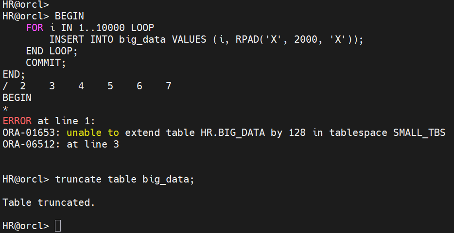 실습용 테이블스페이스 및 테이블 생성 -- STEP 3: [hr] Resumable 모드 OFF 상태에서 대용량 INSERT → 에러 확인 -- 반복 INSERT 프로시저로 공간 부족 유도 BEGIN FOR i IN 1..10000 LOOP INSERT INTO big_data VALUES (i, RPAD('X', 2000, 'X')); END LOOP; COMMIT; END; / /* [결과 — Resumable OFF] ERROR at line 1: ORA-01653: unable to extend table HR.BIG_DATA by 128 in tablespace SMALL_TBS → 즉시 에러 발생 후 롤백됨 (데이터 없음) */ -- 테이블 초기화 TRUNCATE TABLE big_data;