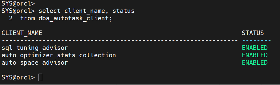 작업 설명 옵티마이저 통계 수집 실행 계획 최적화를 위해 테이블/인덱스 통계 갱신 세그먼트 점검 공간 낭비(Segment Advisor)를 찾아 권고 문제 SQL 진단 SQL Tuning Advisor로 비효율 SQL 자동 분석 -- 자동 유지보수 작업 현황 확인 SELECT client_name, status FROM dba_autotask_client;