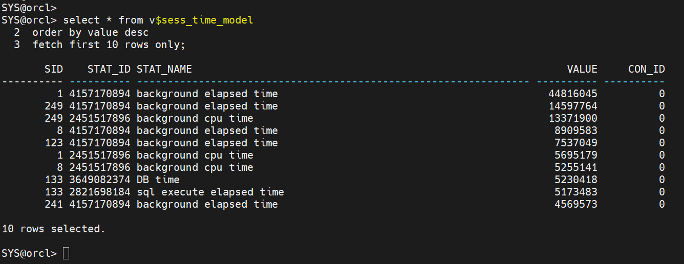 -- 현재 DB에서 리소스를 가장 많이 사용하는 세션 조회 -- (CPU / PGA / Logical Reads / Physical Reads / Hard Parse / Sort 기준) SELECT * FROM v$sess_time_model ORDER BY value DESC FETCH FIRST 10 ROWS ONLY;