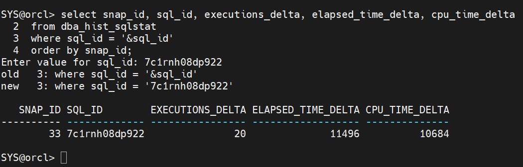 AWR 리포트 생성 확인 -- 특정 SQL의 AWR 히스토리 조회 (sql_id 필요) -- 먼저 sql_text로 sql_id 확인 SELECT sql_id, sql_text FROM v$sql WHERE sql_text LIKE '%employees%' AND rownum <= 5; -- sql_id로 AWR 히스토리 조회 SELECT snap_id, sql_id, executions_delta, elapsed_time_delta, cpu_time_delta FROM dba_hist_sqlstat WHERE sql_id = '&sql_id' ORDER BY snap_id;