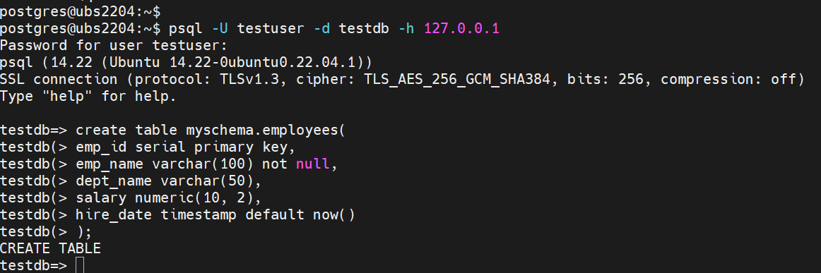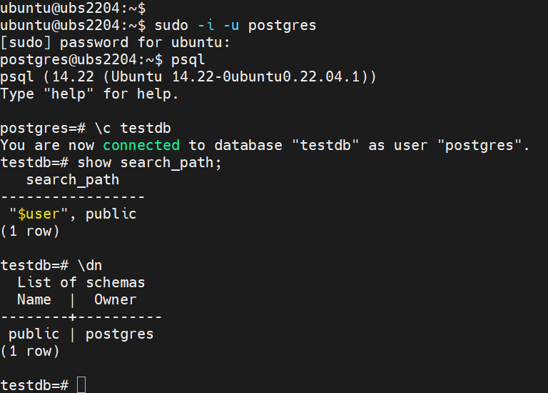 postgres 계정으로 testdb 접속 후 현재 스키마 및 스키마 목록 확인 -- 새 스키마 생성 CREATE SCHEMA myschema AUTHORIZATION testuser; -- 스키마 목록 다시 확인 \dn
