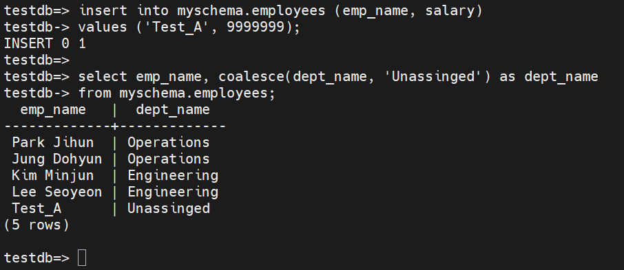-- 부서 이름 없는 테스트용 사원 생성 INSERT INTO myschema.employees (emp_name, salary) VALUES ('Test_A', 9999999); -- NVL 대응: COALESCE SELECT emp_name, COALESCE(dept_name, 'Unassigned') AS dept_name FROM myschema.employees;