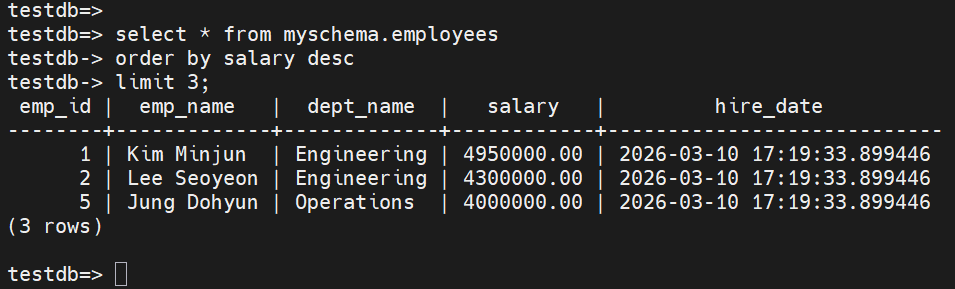 departments에 데이터 삽입 후 확인 -- employees에 데이터 삽입 INSERT INTO myschema.employees (emp_name, dept_name, salary) VALUES ('Kim Minjun', 'Engineering', 4500000), ('Lee Seoyeon', 'Engineering', 4200000), ('Park Jihun', 'Operations', 3800000), ('Choi Sua', 'Planning', 3500000), ('Jung Dohyun', 'Operations', 4000000); -- 결과 확인 SELECT * FROM myschema.employees;