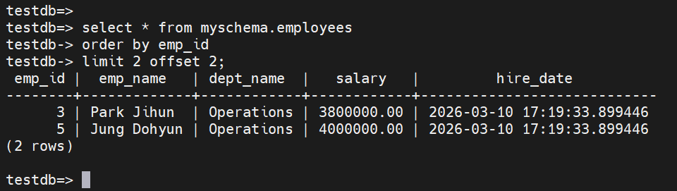 연봉 액수 상위 3건 조회 -- 페이지 처리 (2번째부터 2건) SELECT * FROM myschema.employees ORDER BY emp_id LIMIT 2 OFFSET 2;