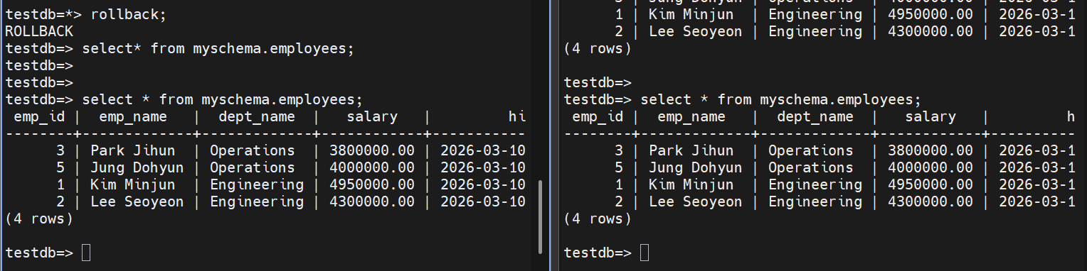 개념 오라클 PostgreSQL 트랜잭션 시작 DML 실행 시 자동 BEGIN 명시 (또는 autocommit) 커밋 COMMIT COMMIT 롤백 ROLLBACK ROLLBACK 저장점 SAVEPOINT SAVEPOINT -- 명시적 트랜잭션 시작 BEGIN; INSERT INTO myschema.employees (emp_name, dept_name, salary) VALUES ('test_user', 'Engineering', 9999999); -- 현재 세션에서 확인 (다른 세션에서는 아직 안 보임) SELECT * FROM myschema.employees WHERE emp_name = 'test_user'; -- 롤백 ROLLBACK; -- 롤백 후 확인 (사라진 것 확인) SELECT * FROM myschema.employees WHERE emp_name = 'test_user';
