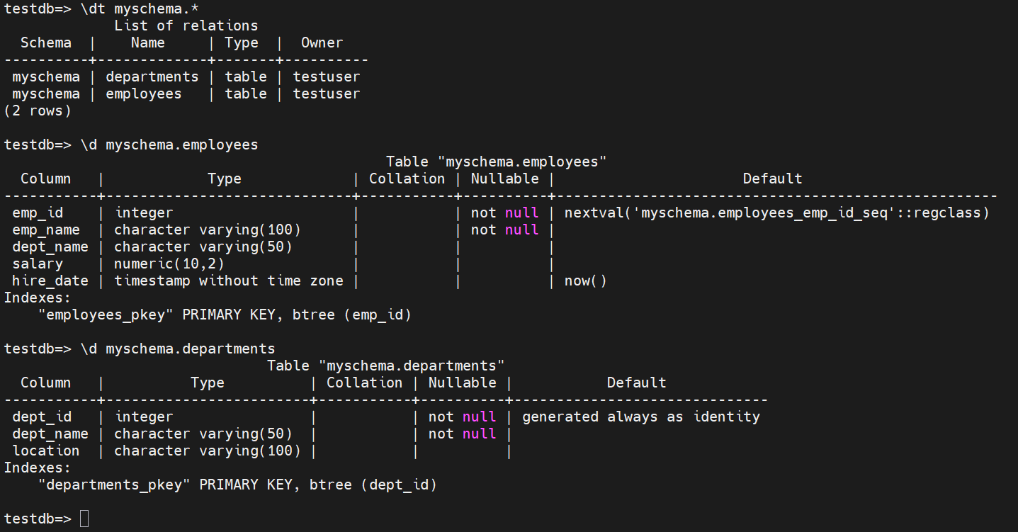 testuser로 testdb 접속 후 serial 방식으로 employees 테이블 생성 -- IDENTITY 방식으로 테이블 생성 (SQL 표준, 권장 방식) CREATE TABLE myschema.departments ( dept_id INTEGER GENERATED ALWAYS AS IDENTITY PRIMARY KEY, dept_name VARCHAR(50) NOT NULL, location VARCHAR(100) );