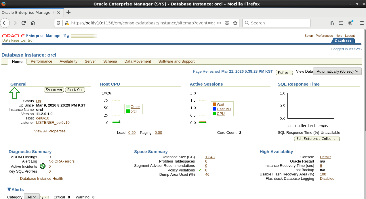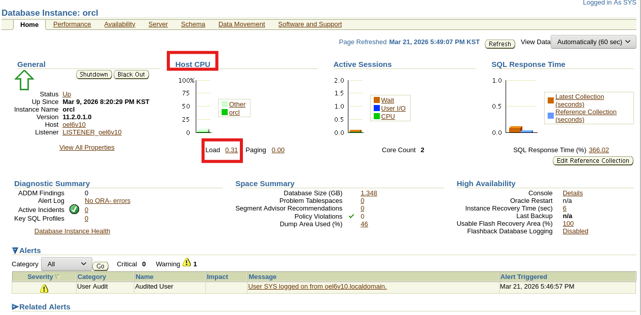 -- CPU 및 I/O 부하를 일으키는 쿼리를 위한 테이블 생성 (오래 걸림) CREATE TABLE test_load AS SELECT * FROM all_objects; -- 아래 쿼리를 실행해두고 EM 화면으로 넘어감 (오래 걸림) SELECT count(*) FROM test_load a, test_load b;