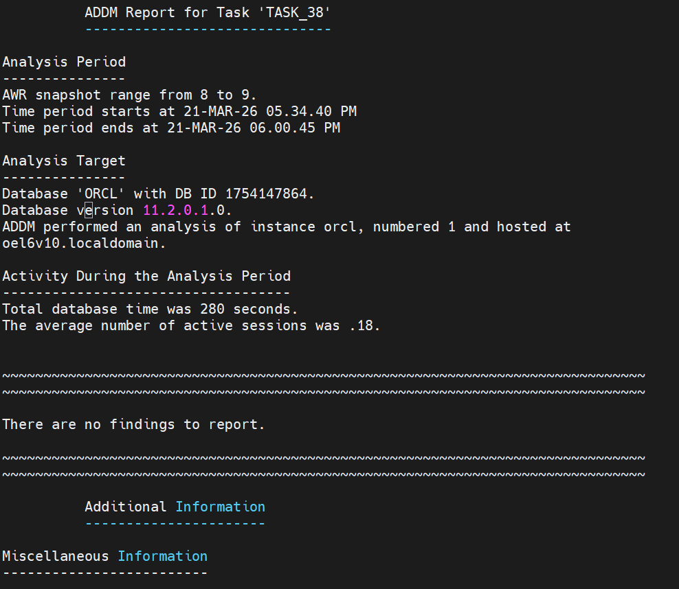 -- ADDM 확인 위해 강한 부하를 주는 쿼리 실행 -- 쿼리 실행 전 스냅샷 찍기 EXEC DBMS_WORKLOAD_REPOSITORY.create_snapshot; -- 무거운 쿼리 실행 (쿼리가 끝날 때까지 대기, 오래 걸림) SELECT count(*) FROM dba_source a, dba_source b; -- 쿼리 종료 후 스냅샷 찍기 EXEC DBMS_WORKLOAD_REPOSITORY.create_snapshot;