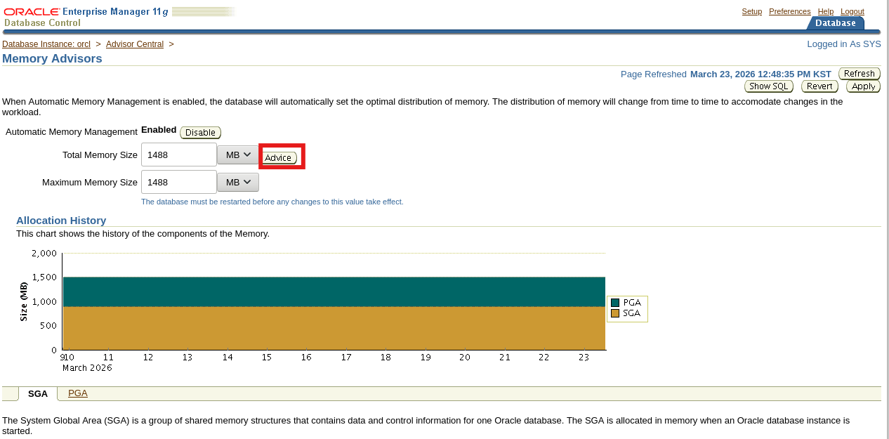 Server 탭 Database Configuration -> Memory Advisors 클릭