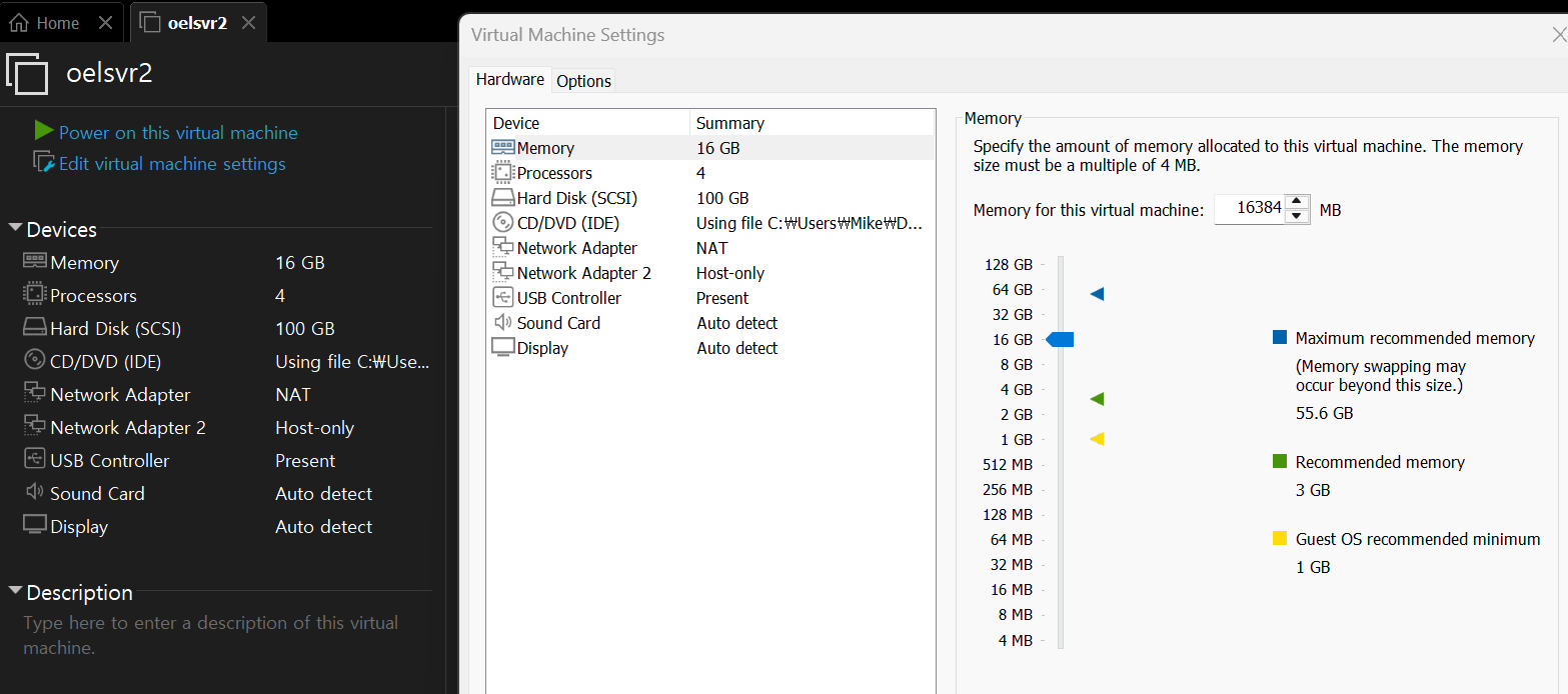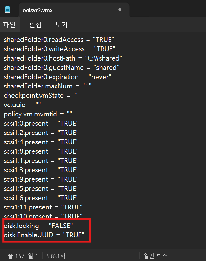 [Windows 파일 탐색기에서 진행] 1) VM 저장 경로로 이동 2) oelsvr1.vmx 파일 → 마우스 우클릭 → 연결 프로그램 → 메모장 3) 텍스트 문서 맨 아래에 아래 두 줄 추가 disk.locking = "FALSE" disk.EnableUUID = "TRUE" 4) Ctrl + S 저장 → 메모장 닫기 5) VMware에서 VM 다시 기동
