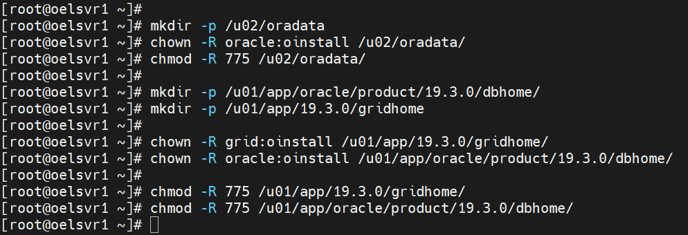 grid, oracle, orainventory 디렉토리 생성 후 소유자 및 권한 설정 -- 데이터파일 저장 디렉토리 mkdir -p /u02/oradata chown -R oracle:oinstall /u02/oradata/ chmod -R 775 /u02/oradata/ -- Grid / DB ORACLE_HOME 디렉토리 생성 mkdir -p /u01/app/oracle/product/19.3.0/dbhome mkdir -p /u01/app/19.3.0/gridhome -- ORACLE_HOME 소유자 및 권한 설정 chown -R grid:oinstall /u01/app/19.3.0/gridhome chown -R oracle:oinstall /u01/app/oracle/product/19.3.0/dbhome chmod -R 775 /u01/app/19.3.0/gridhome chmod -R 775 /u01/app/oracle/product/19.3.0/dbhome