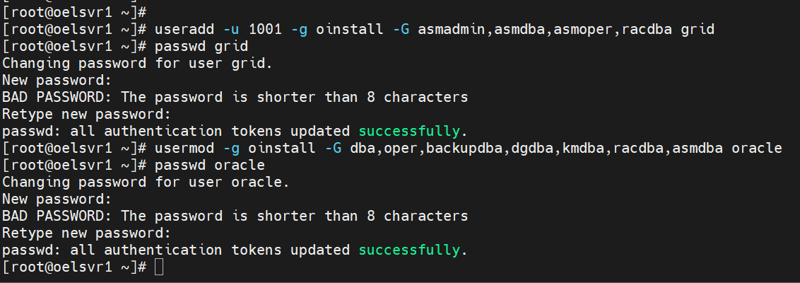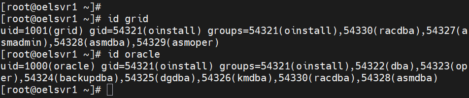 grid 계정 생성 및 oracle 계정 그룹 추가 -- 계정 및 그룹 확인 id grid id oracle