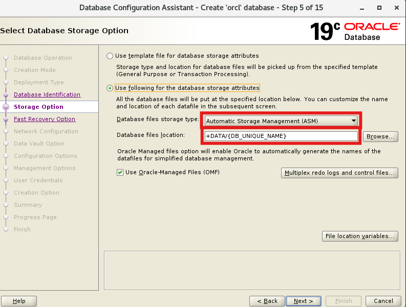 Storage Option에서 storage type은 ASM 선택, db파일 위치 'DATA' 디스크 그룹 확인