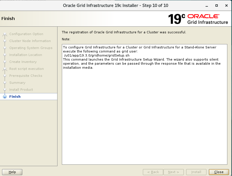 이후 설치 진행해서 설치 완료 -- root 계정에서 roothas.sh 스크립트 실행 su - root . /u01/app/19.3.0/gridhome/crs/install/roothas.sh -- grid 계정에서 ASMCA 그래픽 툴 실행 su - grid asmca