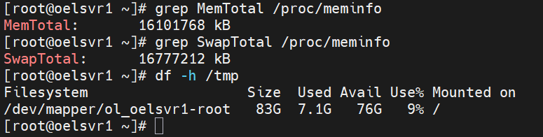 -- 메모리 확인 (Grid는 8GB 이상, DB는 1GB 이상 필요) grep MemTotal /proc/meminfo -- Swap 공간 확인 (메모리의 1~1.5배, 16GB 미만) grep SwapTotal /proc/meminfo -- /tmp 공간 확인 (1GB 이상 필요) df -h /tmp