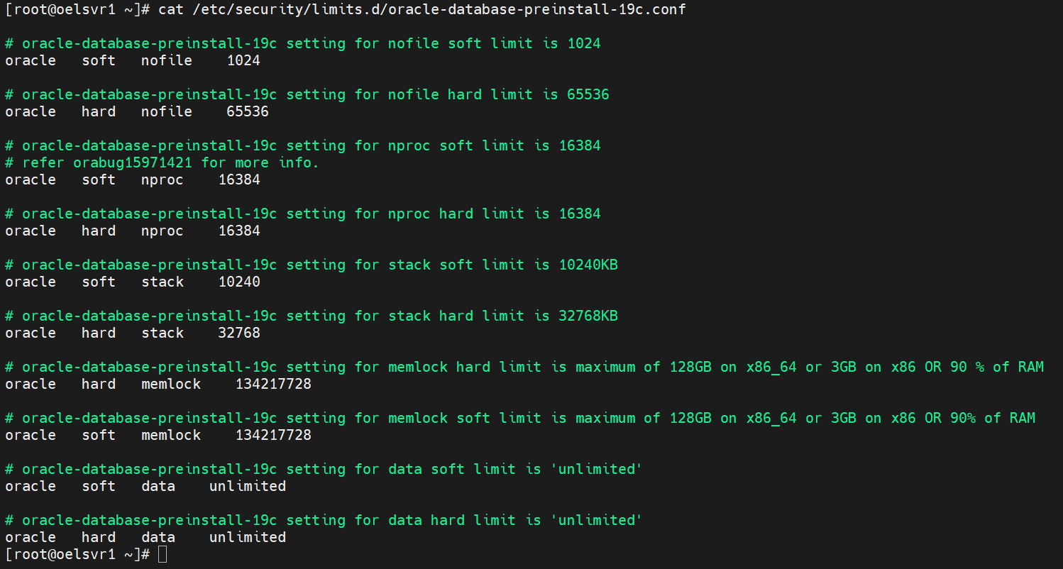 -- 현재 자동 세팅된 값 먼저 확인 cat /etc/security/limits.d/oracle-database-preinstall-19c.conf -- 부족한 값 추가 vi /etc/security/limits.conf -- 세팅값 oracle soft nofile 4096 oracle hard nofile 65536 oracle soft nproc 16384 oracle hard nproc 16384 oracle soft stack 10240 oracle hard stack 32768 oracle soft memlock 3145728 oracle hard memlock 3145728 grid soft nofile 4096 grid hard nofile 65536 grid soft nproc 16384 grid hard nproc 16384 grid soft stack 10240 grid hard stack 32768 grid soft memlock 3145728 grid hard memlock 3145728