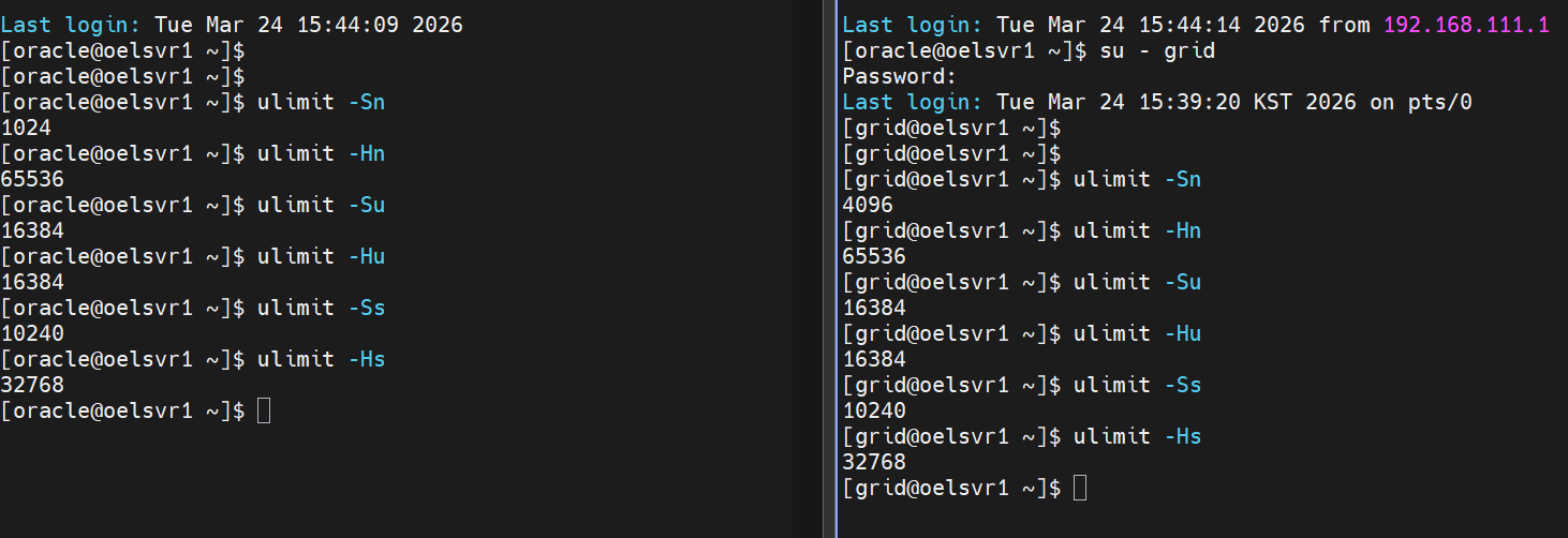 limits.conf에 grid 관련 세팅값 추가 -- 변경 후 서버 재부팅 reboot -- 재부팅 후 oracle/grid 계정에서 적용 확인 ulimit -Sn # → 4096 (soft nofile) ulimit -Hn # → 65536 (hard nofile) ulimit -Su # → 16384 (soft nproc) ulimit -Hu # → 16384 (hard nproc) ulimit -Ss # → 10240 (soft stack) ulimit -Hs # → 32768 (hard stack)