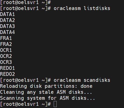ASM 디스크 11개 생성 -- 등록된 ASM 디스크 목록 확인 oracleasm listdisks -- ASM 디스크 스캔 (부팅 후 재인식이 필요할 때도 사용) oracleasm scandisks