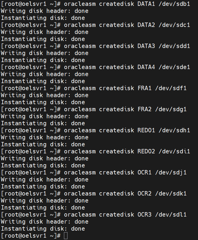 -- +DATA 그룹용 (데이터파일 / 컨트롤파일 / 파라미터파일) oracleasm createdisk DATA1 /dev/sdb1 oracleasm createdisk DATA2 /dev/sdc1 oracleasm createdisk DATA3 /dev/sdd1 oracleasm createdisk DATA4 /dev/sde1 -- +FRA 그룹용 (아카이브 로그 / 백업 / Flashback 로그) -- Data Guard 구성 시 Standby DB의 아카이브 로그도 FRA에 저장됨 oracleasm createdisk FRA1 /dev/sdf1 oracleasm createdisk FRA2 /dev/sdg1 -- +REDO 그룹용 (온라인 Redo Log 전용 — DATA와 I/O 분리로 성능 향상) oracleasm createdisk REDO1 /dev/sdh1 oracleasm createdisk REDO2 /dev/sdi1 -- +OCR 그룹용 (OCR / Voting Disk — RAC 구성 시 사용) -- Voting Disk는 쿼럼 알고리즘 → 반드시 홀수(3개) 필요 -- 단일 노드에서는 미사용, RAC 확장 시 바로 활용 가능하도록 예약 oracleasm createdisk OCR1 /dev/sdj1 oracleasm createdisk OCR2 /dev/sdk1 oracleasm createdisk OCR3 /dev/sdl1