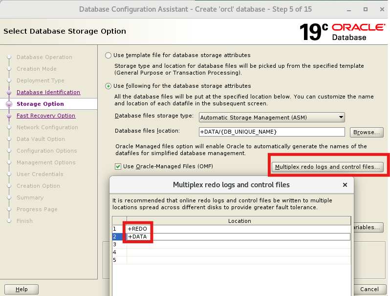 Multiplex redo logs and control files 클릭 후 1번에 '+REDO', 2번에 '+DATA' 입력
