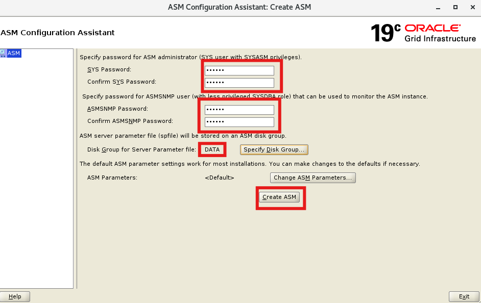 sys와 asmsnmp 암호 입력 및 디스크 그룹 'DATA'인 것 확인, Create ASM 선택